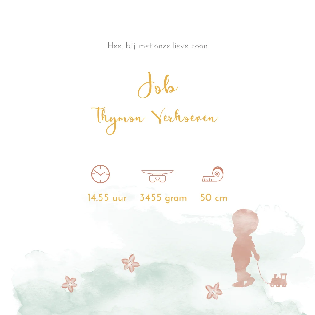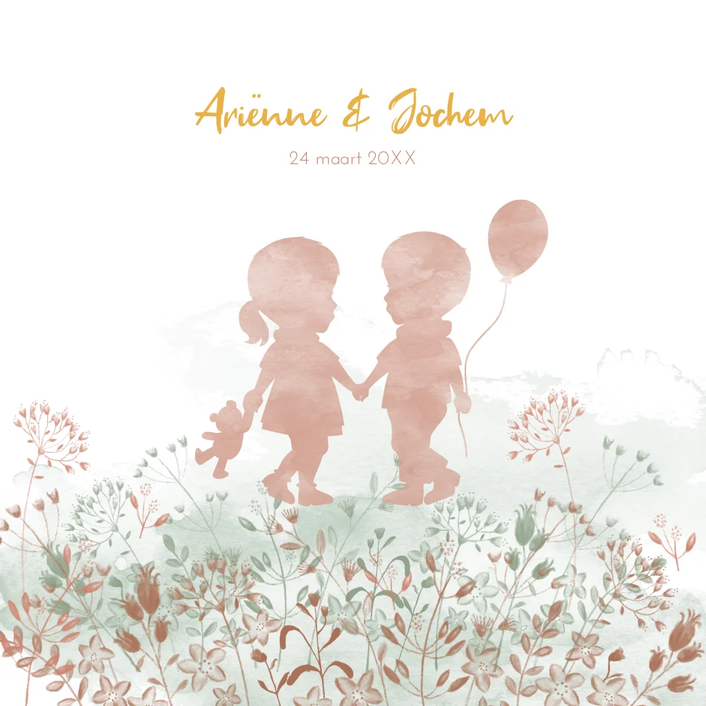 Lief geboortekaartje met een silhouet van een tweeling zusje en broertje met handgetekende bloemetjes. De aquarel tweeling staat hand in hand en de bloemen kun je zelf aanpassen en geeft een tof effect.