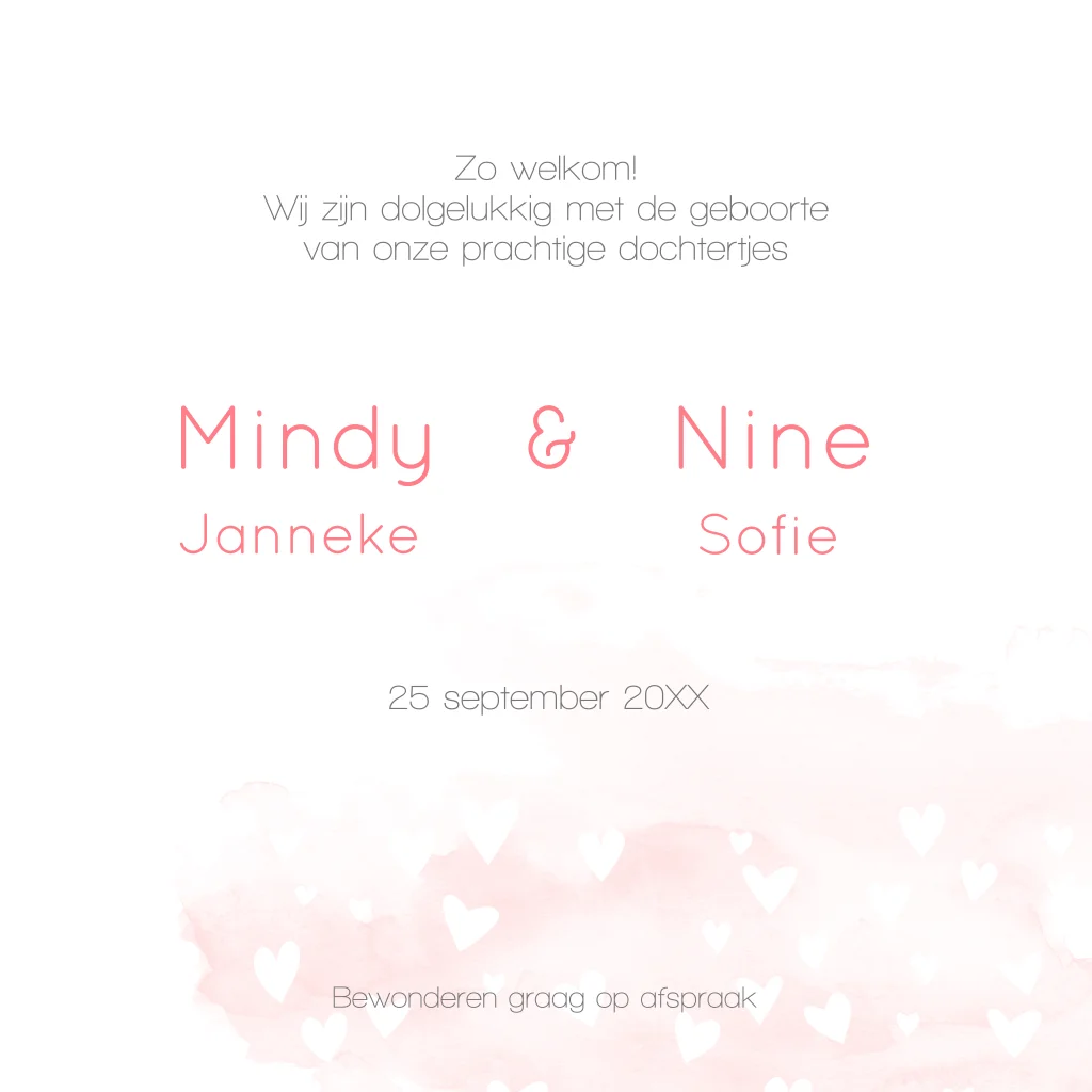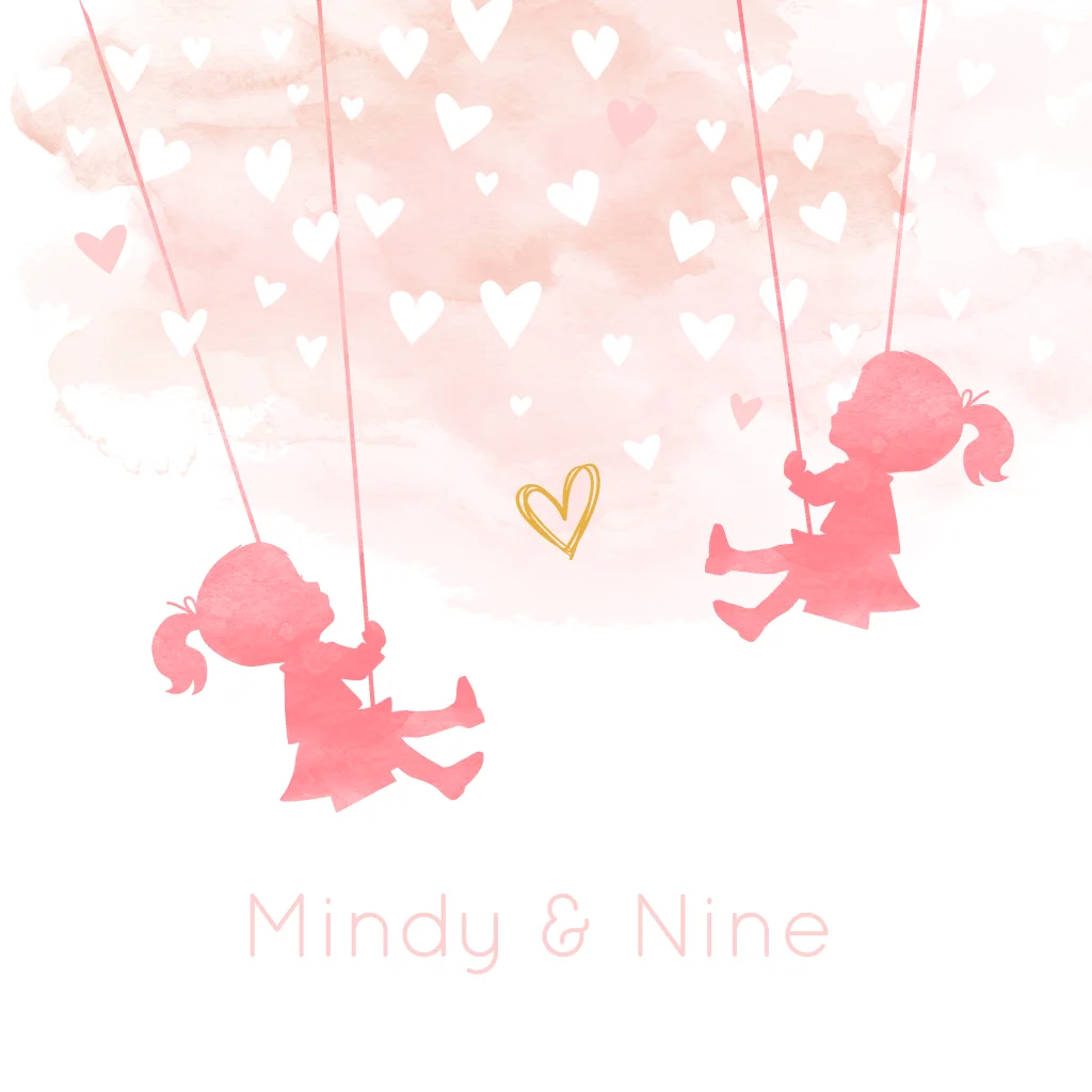 Lief geboortekaartje met silhouet van twee meisjes op een schommel met waterverf en confetti van hartjes. Pas deze tweelingkaart naar eigen idee aan.