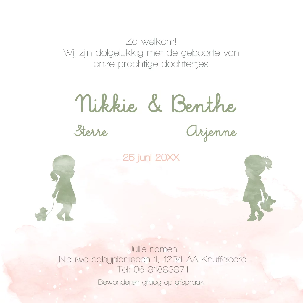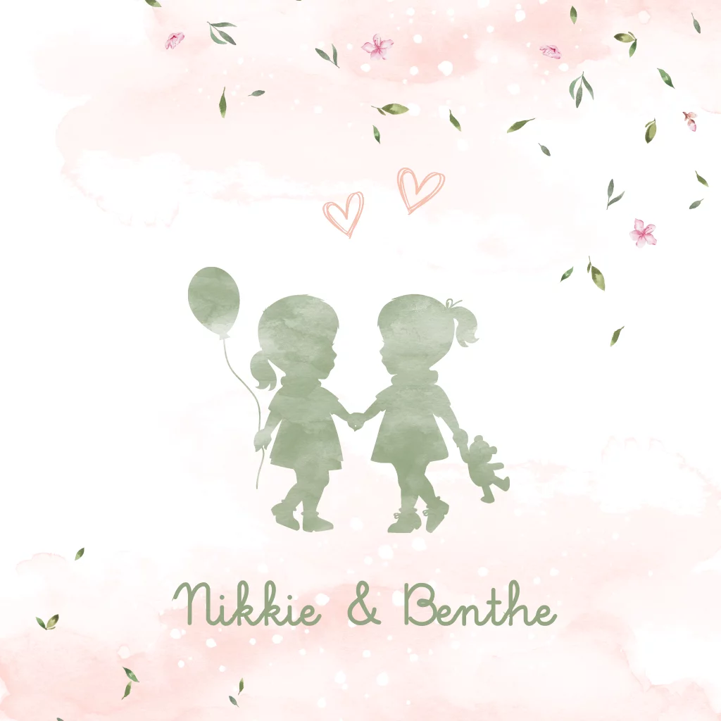 Lief geboortekaartje met silhouet van een tweeling, twee meisjes, met waterverf en confetti van blaadjes. Pas deze tweelingkaart eenvoudig naar je eigen idee en gezinssituatie aan, kies uit de afbeeldingen in onze beeldbank.