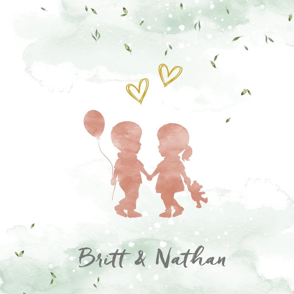 Lief geboortekaartje met silhouet van een tweeling, een jongetje en een meisje, met waterverf en confetti van blaadjes. Pas deze tweelingkaart eenvoudig naar je eigen idee en gezinssituatie aan, kies uit de afbeeldingen in onze beeldbank.