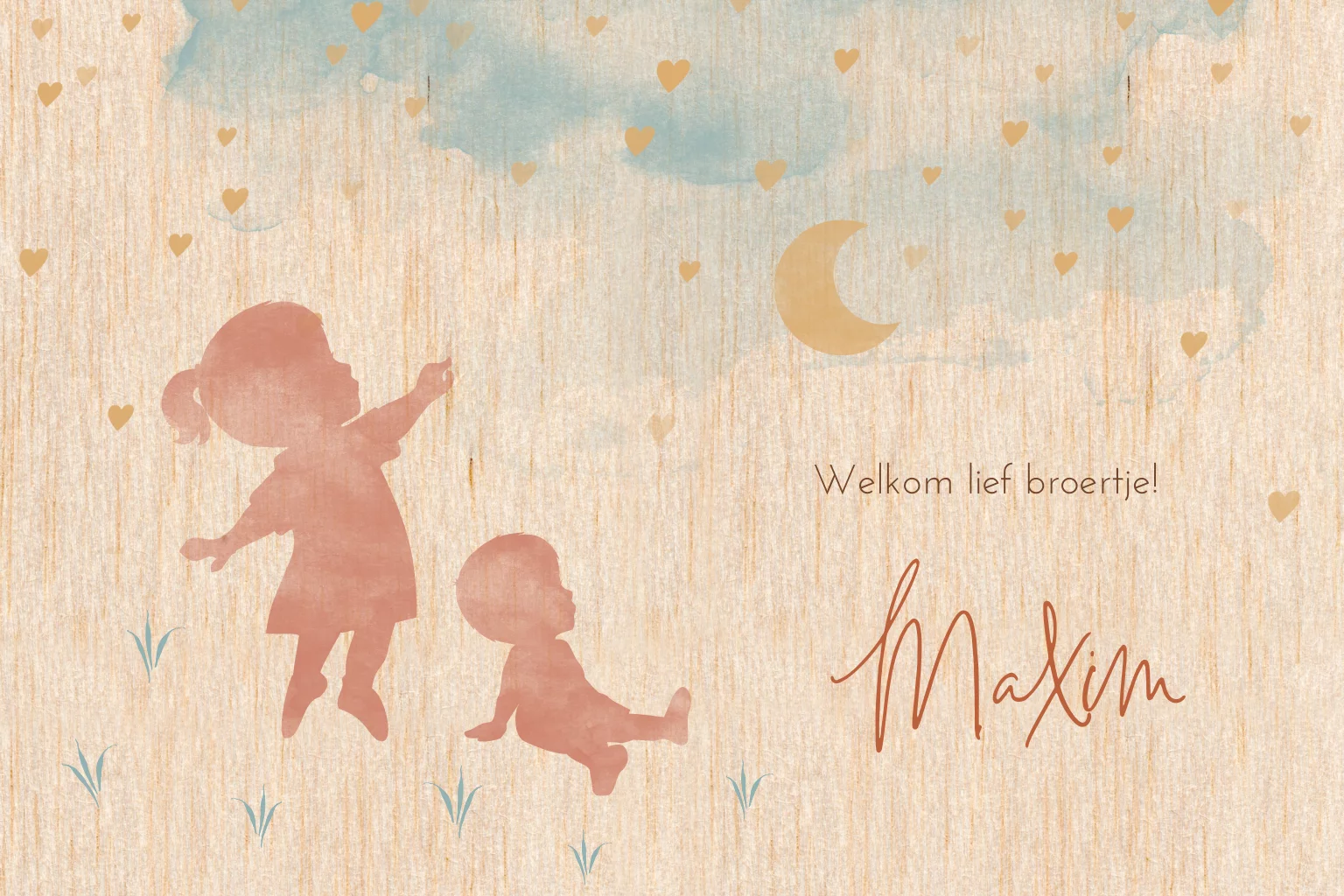 Echt houten geboortekaartje met aquarel en broertje en zusje
