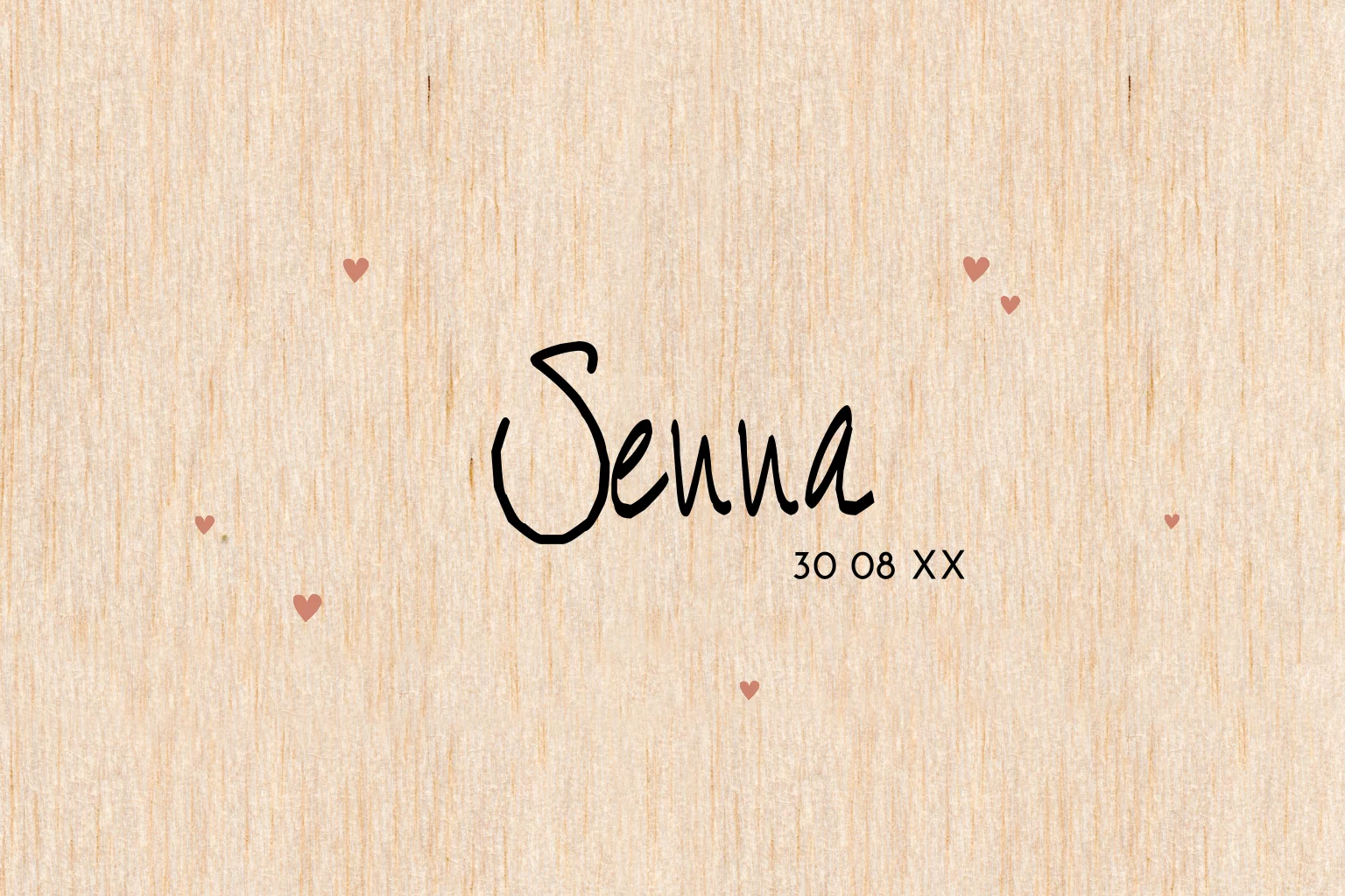 Hippe houten geboortekaart unisex, met de naam en kleine hartjes op de voorkant. Deze minimalistisch kaart kun je zelf personaliseren met de afbeeldingen uit de beeldbank.