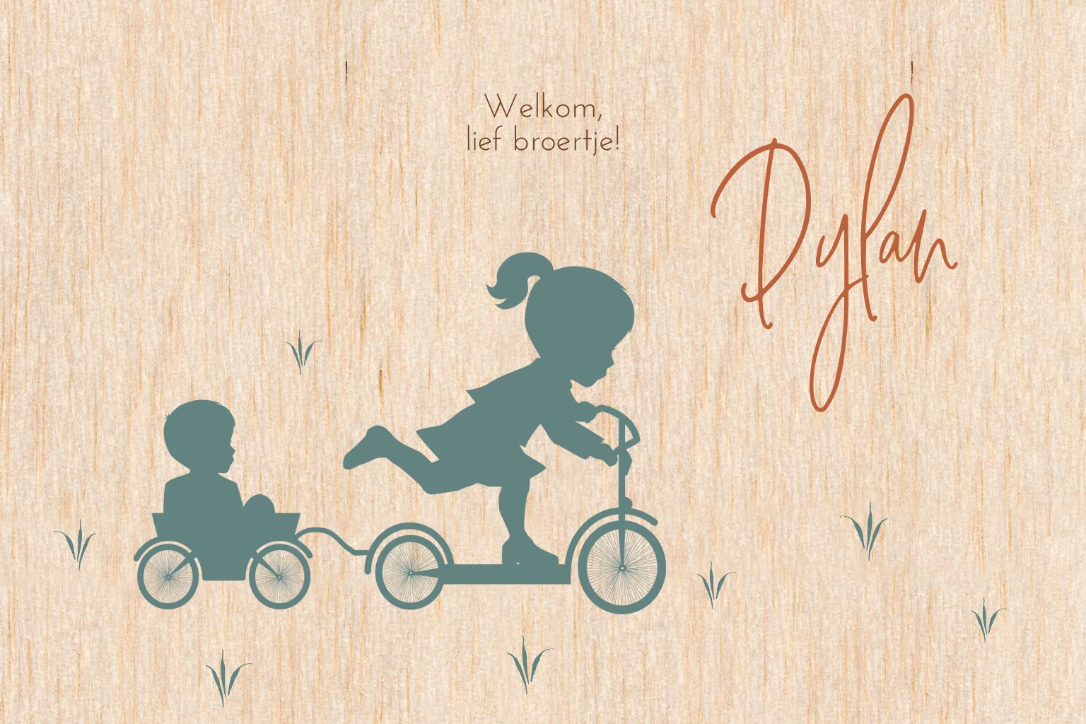 Hippe houten geboortekaart met een silhouet van een jongen en een meisje op de step. Deze kaart kun je zelf personaliseren met de afbeeldingen uit de beeldbank.