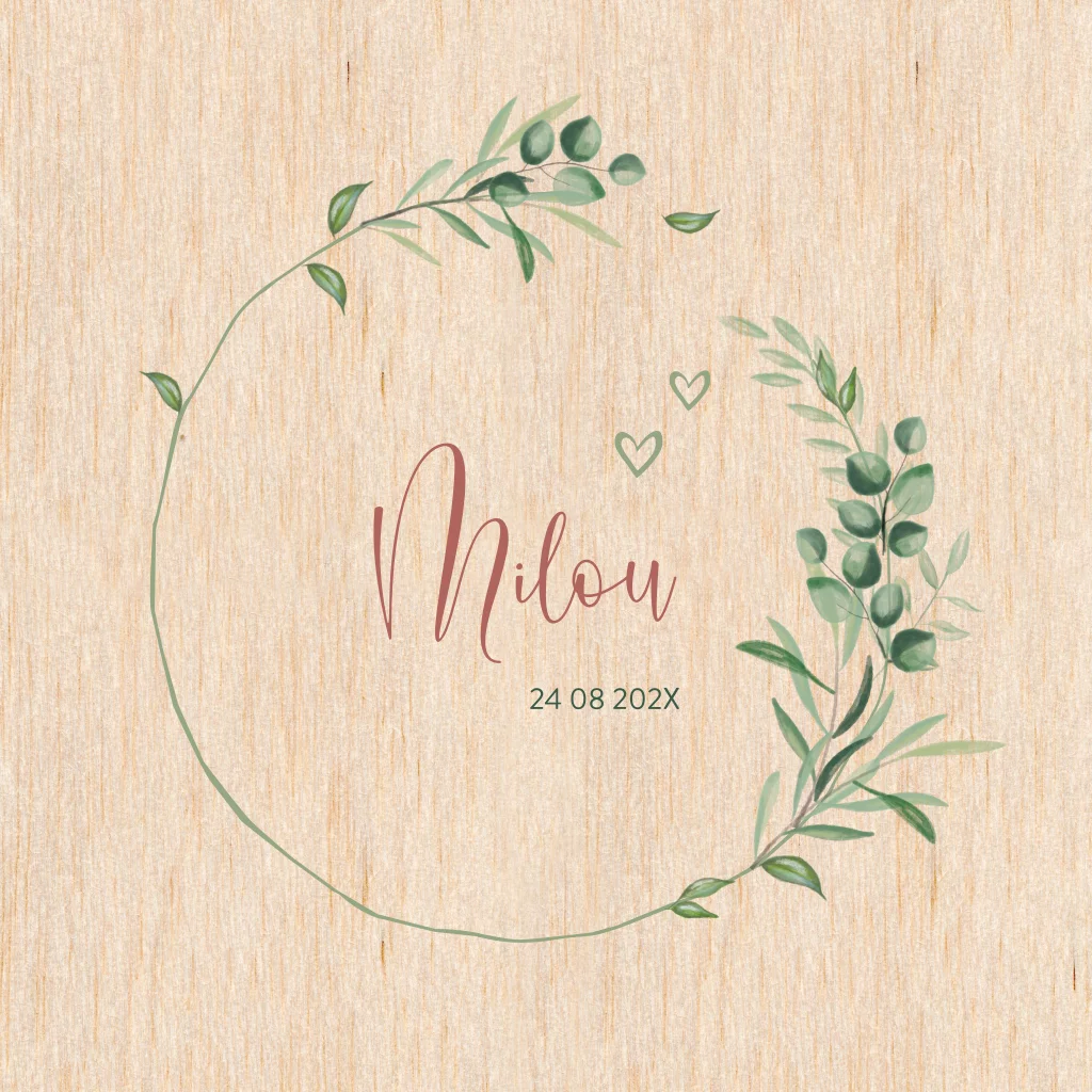 Echt houten geboortekaartje met groene blaadjes
