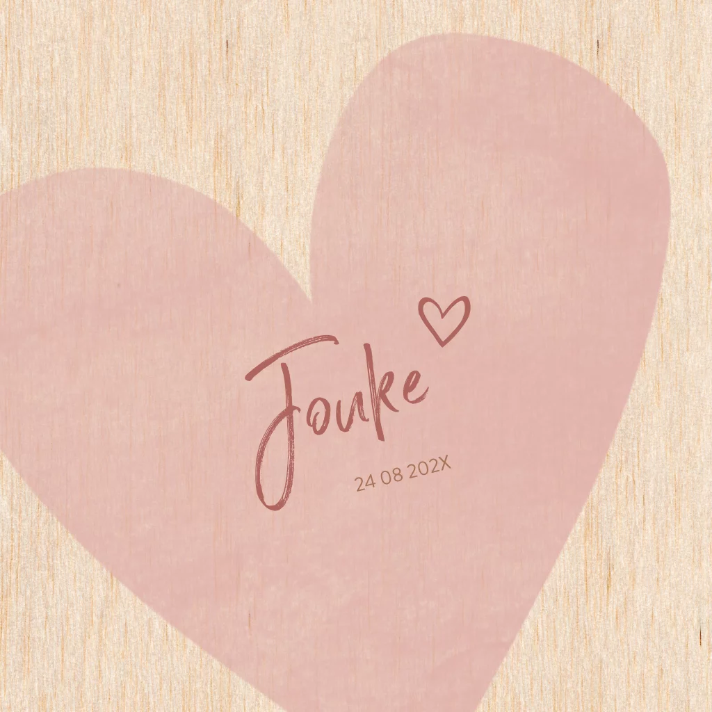 Prachtig houten geboortekaartje met een groot waterverf hart en kleine geboorte icoontjes. Deze kaart kun je eenvoudig zelf personaliseren.