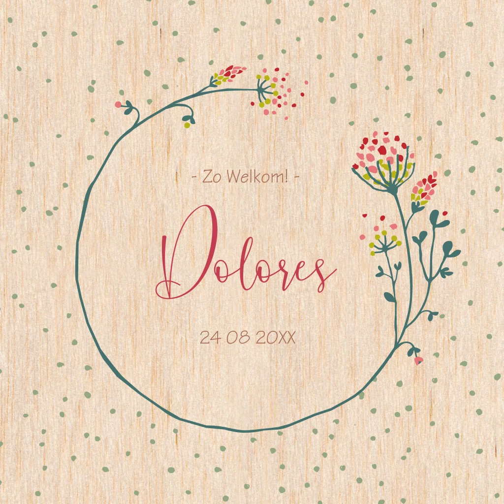 Prachtig houten geboortekaartje met een botanische krans van grafische takjes en bloemen. Deze kaart kun je eenvoudig zelf personaliseren.