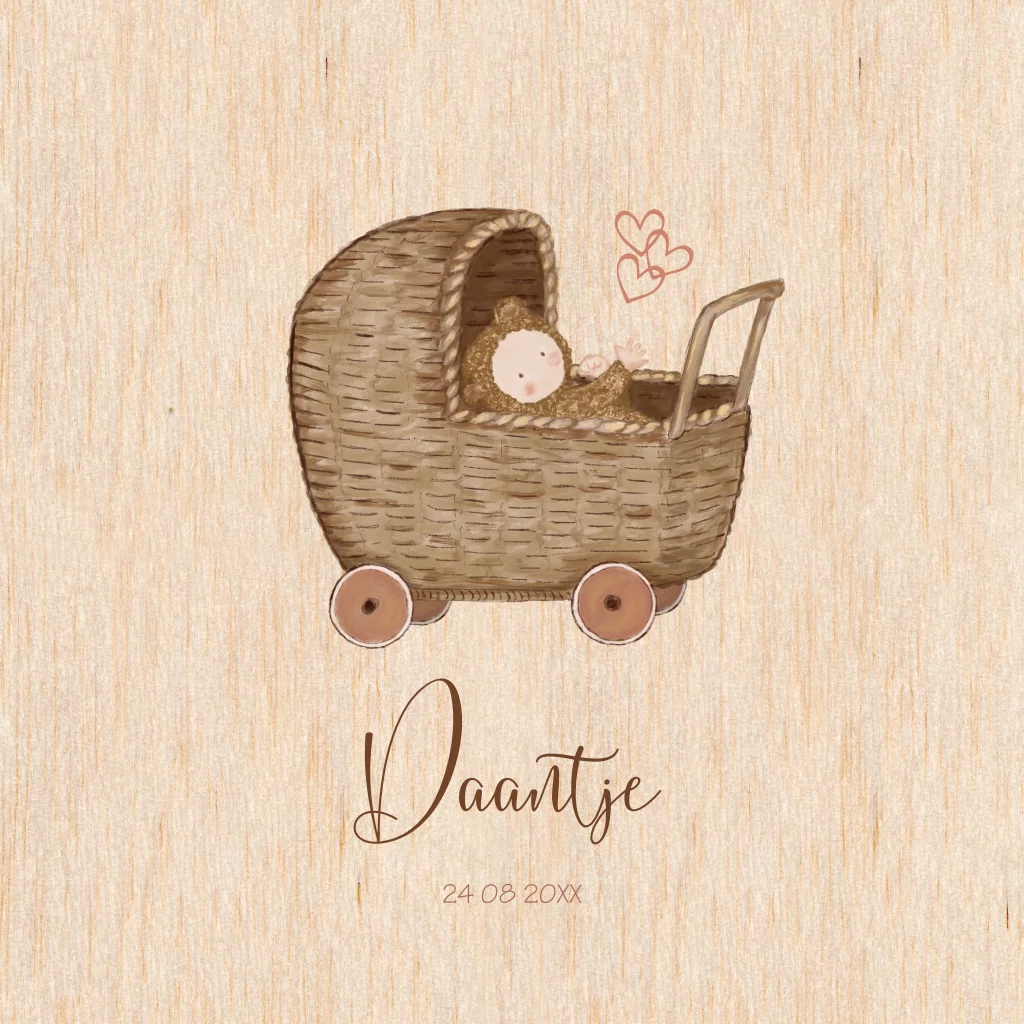 Prachtig houten unisex geboortekaartje met een illustratie van een rieten wiegje met een baby. Deze kaart kun je eenvoudig zelf personaliseren.