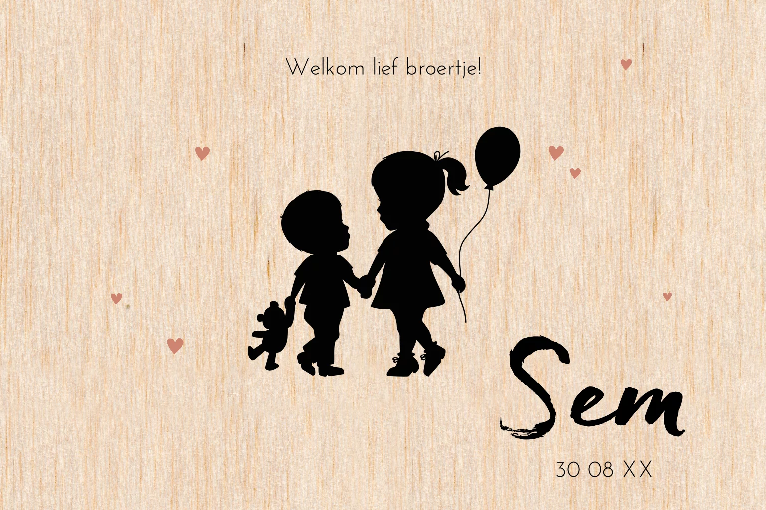 Echt houten geboortekaartje met silhouet jongen en grote zus
