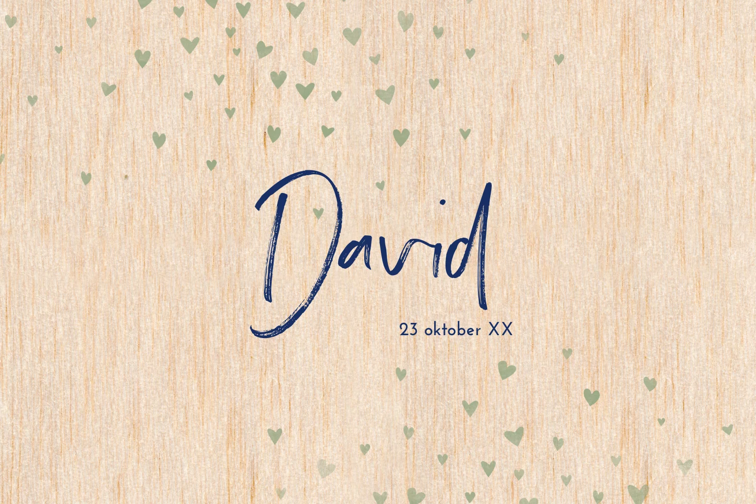 Mooie liggende houten kaart waarbij de naam centraal staat tussen confetti van kleine waterverf hartjes. Deze kaart heeft ronde hoeken en kun je eenvoudig andere kleuren geven.