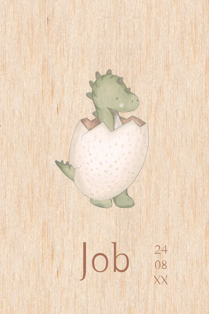 Mooie houten geboortekaart met een schattige illustratie van een dinosaurus, draakje in een ei. Dit geboortekaartje met deze dino kan ook op papier worden gedrukt of op een ander formaat.