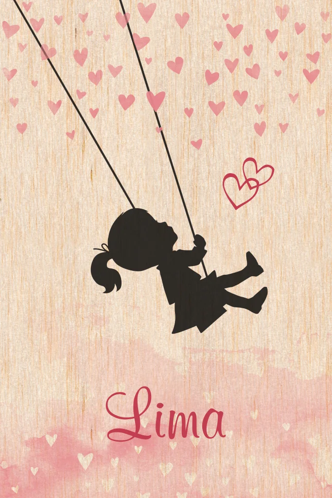Lief geboortekaartje op echt hout met het silhouet van een meisje op een schommel en kleine waterverf hartjes. Personaliseer dit kaartje eenvoudig naar eigen wens.