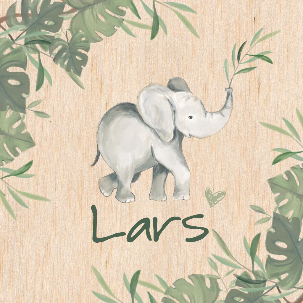 Prachtig houten geboortekaartje met handgetekende olifant en jungle bladeren.