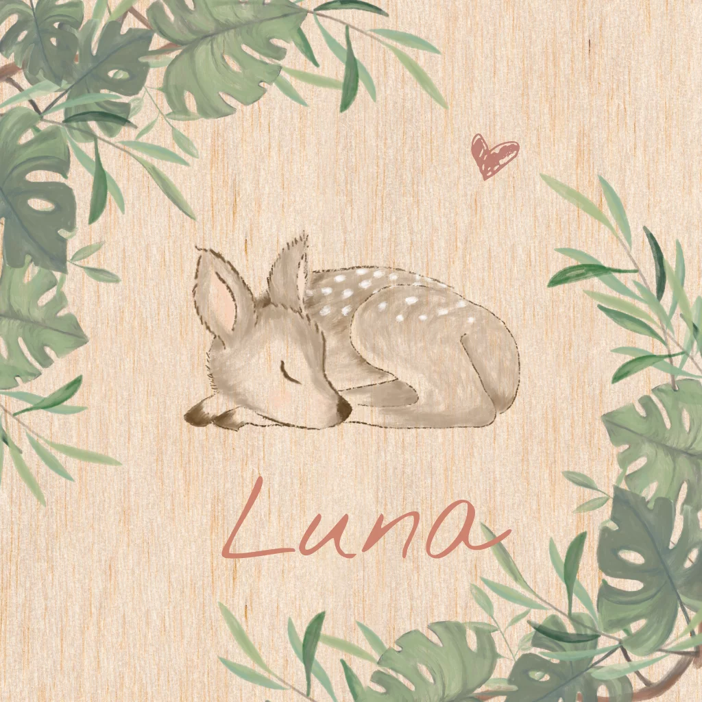 Botanisch houten geboortekaartje met handgetekend hertje en jungle bladeren.