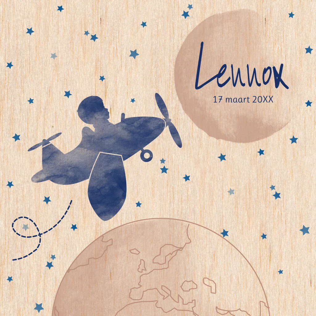 Houten vierkant geboortekaartje met vliegtuigje en sterretjes