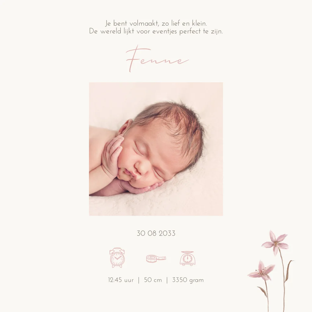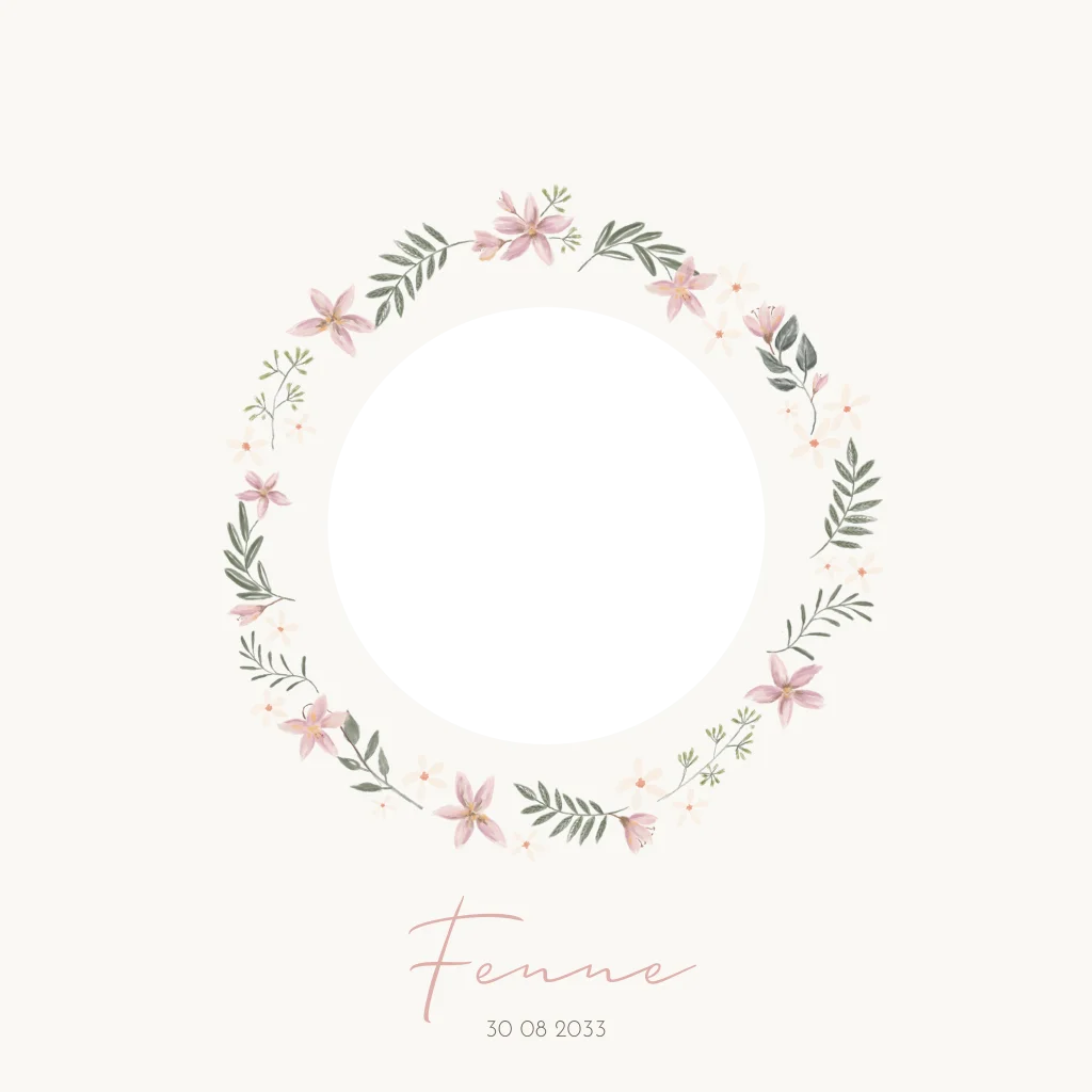 Een schattig geboortekaartje met een doorkijkje waardoor de foto aan de binnenzijde tevoorschijn komt. Je kunt de foto ook verwijderen en de naam in de binnenzijde plaatsen. Aan de voor en binnenzijde een lieve krans met bloemetjes, blaadjes en plantjes.