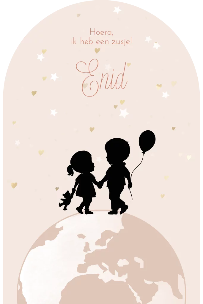 Dit lieve geboortekaartje voor een dochtertje met broertje en/of zusje kun je eenvoudig aanpassen. Het geboortekaartje heeft een boog-vorm met een wereldbol en de silhouetten van een broertje en zusje hand in hand. Kijk in onze beeldbank voor meer silhouetten en kies een passende afbeelding.