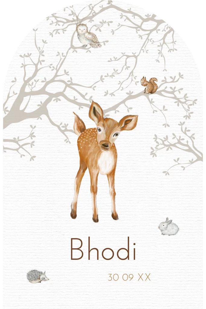 Lief geboortekaartje met arch-vorm met een geschilderd hertje en andere bosdieren zoals een uil, een eekhoorn, een egeltje en een konijn