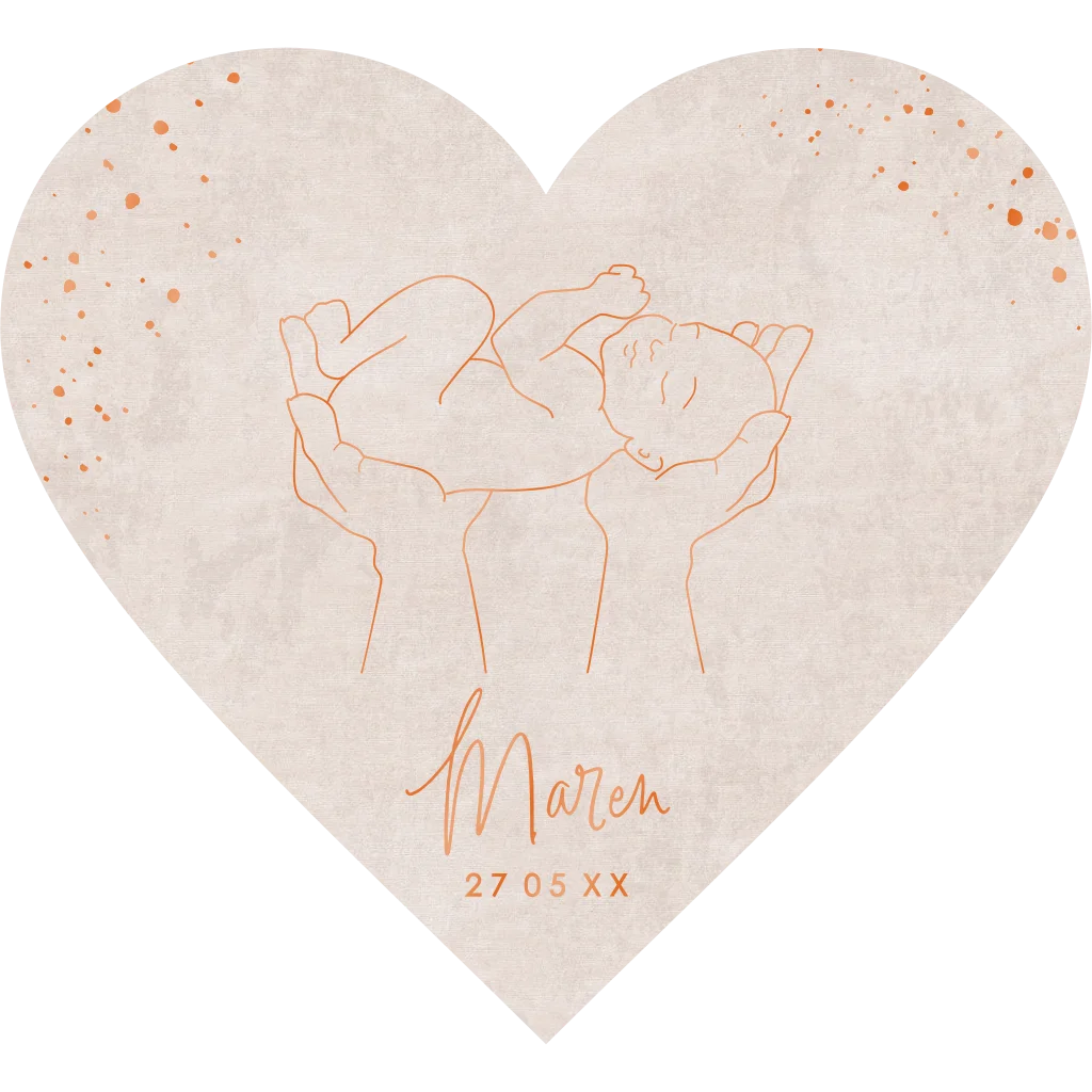 Schattig geboortekaartje in de vorm van een hart met twee handen die een baby dragen . Babykaartje met folie lijntekening illustratie van baby in handen en confetti.