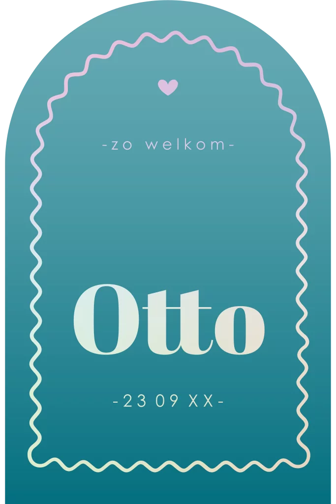 Een prachtige geboortekaart met een ronde bovenkant en de naam en een kronkellijn in foliedruk wat een prachtige sjieke glans geeft. Op deze arch-vorm geboortekaart is holografische inkt gebruikt, maar pas de folie en achtergrondkleur zelf aan in de online editor