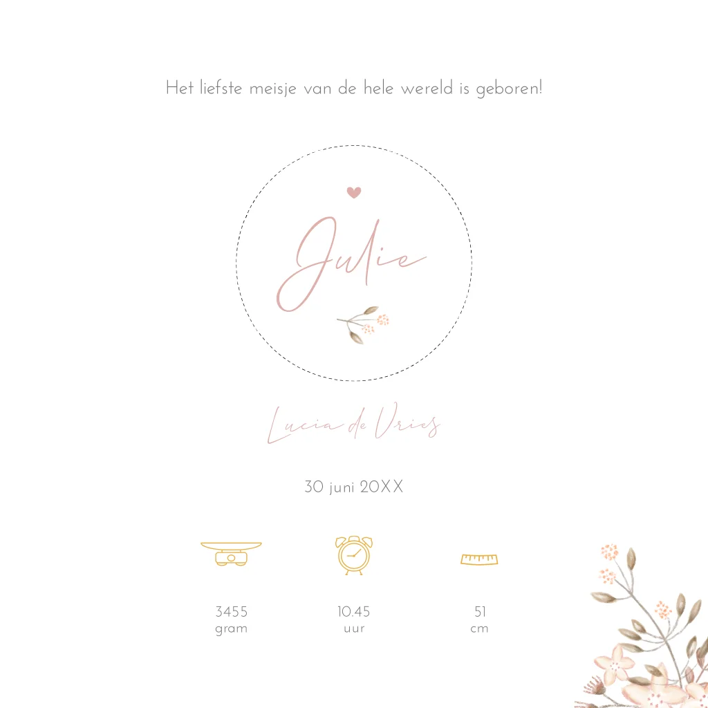 Een schattig geboortekaartje voor een meisje met een waterverf silhouet en geschilderde veldbloemen. Dit kaartje heeft een stans doorkijkje waar de naam van jullie kindje in tevoorschijn komt.
