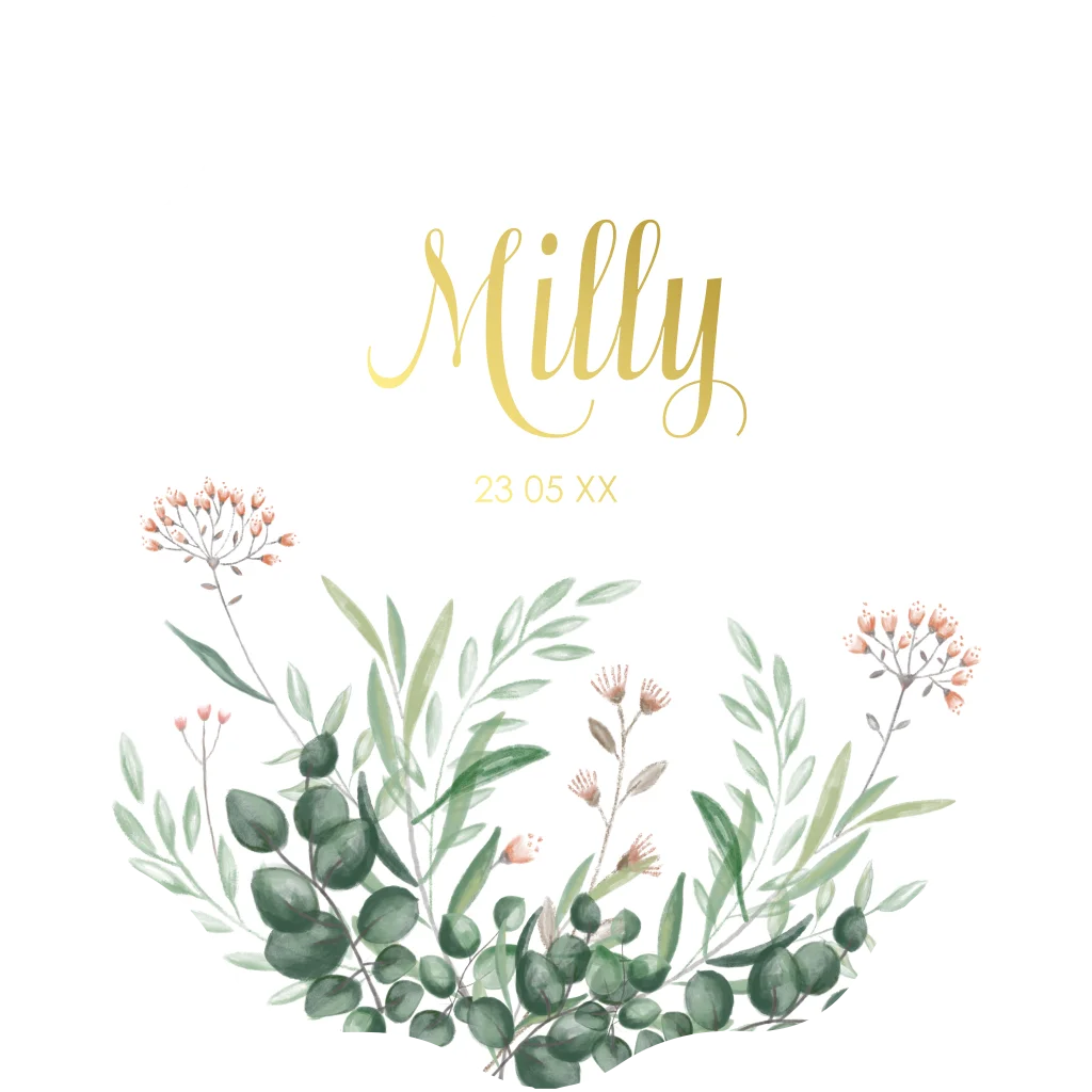 Originele geboortekaart in een bloemvorm met golvende rand en groene bloemen en blaadjes. Deze kaart kun je eenvoudig zelf personaliseren door de teksten in folie te zetten