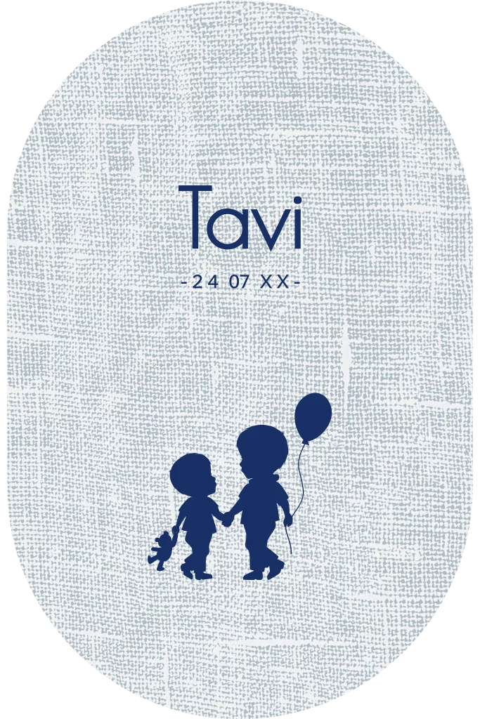 Een toffe stans geboortekaart in een ovale vorm met een linnen structuur achtergrond en het silhouet van een jongetje met zijn grote broer, een ballon en een beertje