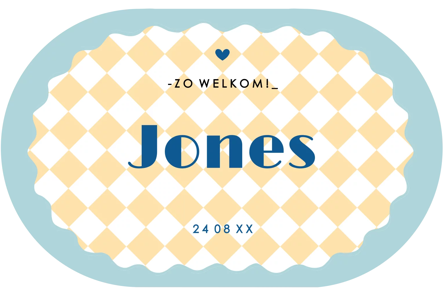 Liggende ovale geboortekaart met een trendy ruitjes dessin in vrolijke kleuren. Deze kleuren, de tekst en het lettertype kun je zelf naar eigen idee aanpassen.