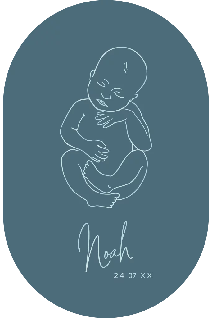 Een hele bijzondere geboortekaartje in een ovale vorm met een lijntekening van een baby geprint in hoogglans waardoor de inkt een mooie glans krijgt. Pas de kleuren eenvoudig zelf aan bij deze prachtige kaart.