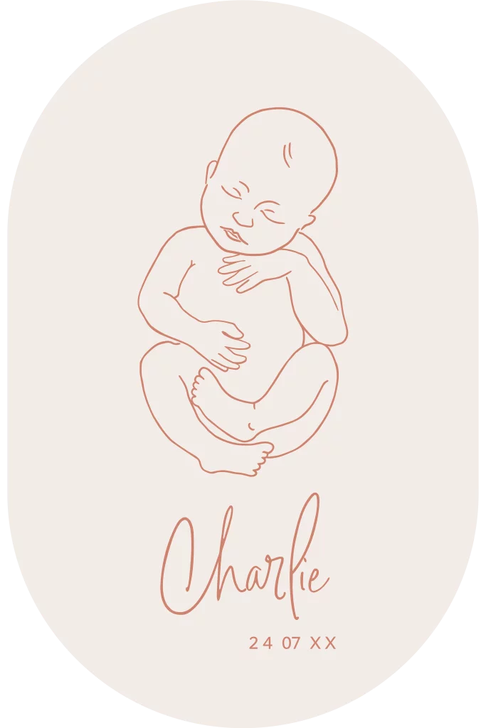 Een heel bijzonder geboortekaartje in een ovale vorm met een lijntekening van een baby geprint. Pas de kleuren eenvoudig zelf aan bij deze prachtige kaart, ook mooi; kies voor hoogglans of goudfolie.