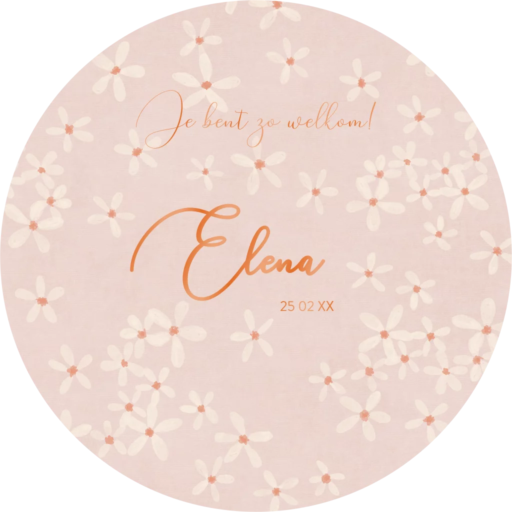 Schattig geboortekaartje met dessin van lieve handgetekende bloemetjes met aan de voorkant de naam in hoogglans druk.