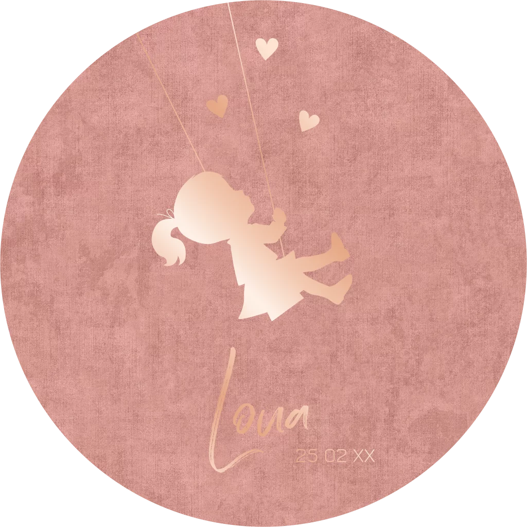 Deze hippe ronde silhouet geboortekaart met goudfolie kun je eenvoudig zelf aanpassen. Op dit geboortekaartje staat een lief meisje op een schommel in foliedruk met een rode velvet structuur op de achtergrond.