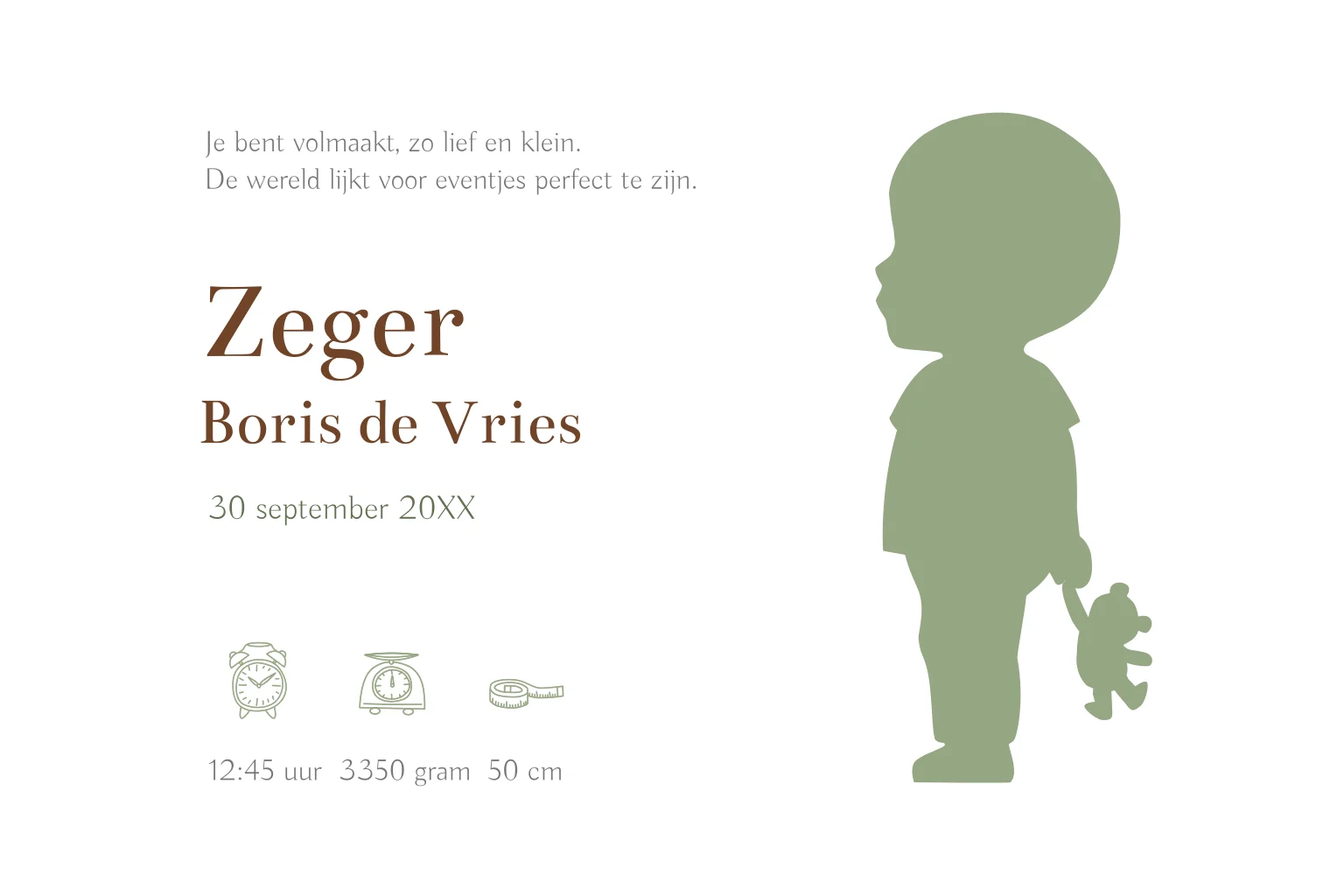 Een super mooi stans geboortekaartje voor een jongetje met waterverf takjes en plantjes. Op de voorzijde van deze toffe geboortekaart is het silhouet van een jongetjes uitgesneden.
