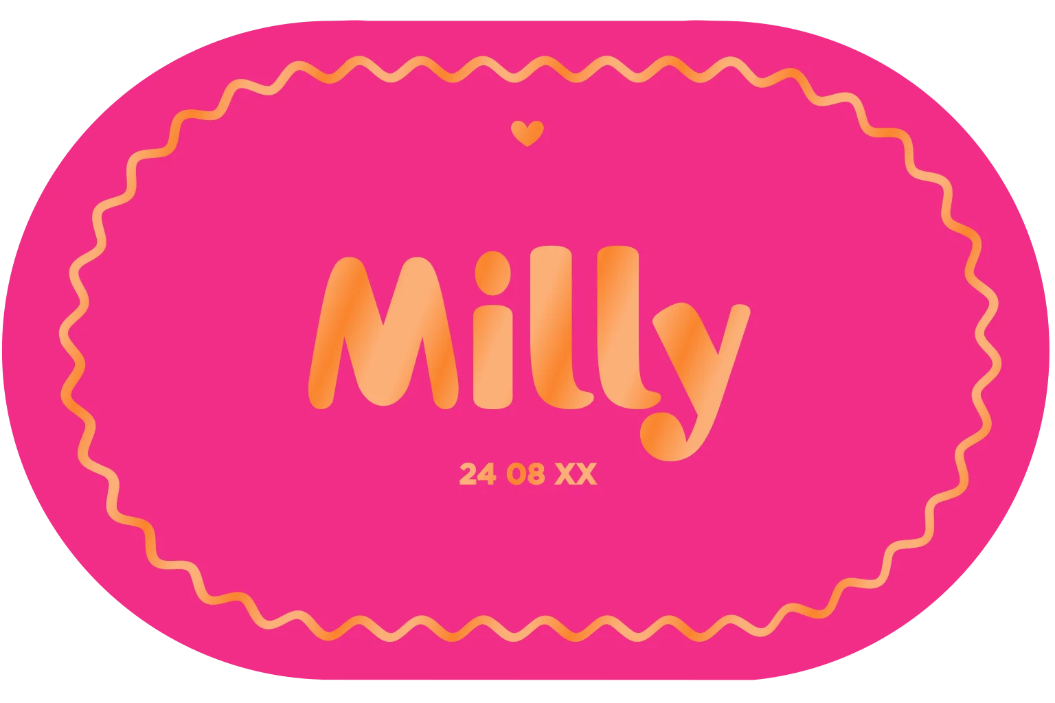 Een hippe liggende ovale geboortekaart met een golvend randje in fel roze en oranje kleuren die je ook zelf kunt aanpassen. De naam is hier in hoogglans inkt gedrukt waardoor het een prachtig glanzend effect geeft! Deze super vrolijke geboortekaart is een genot om in je brievenbus te ontvangen