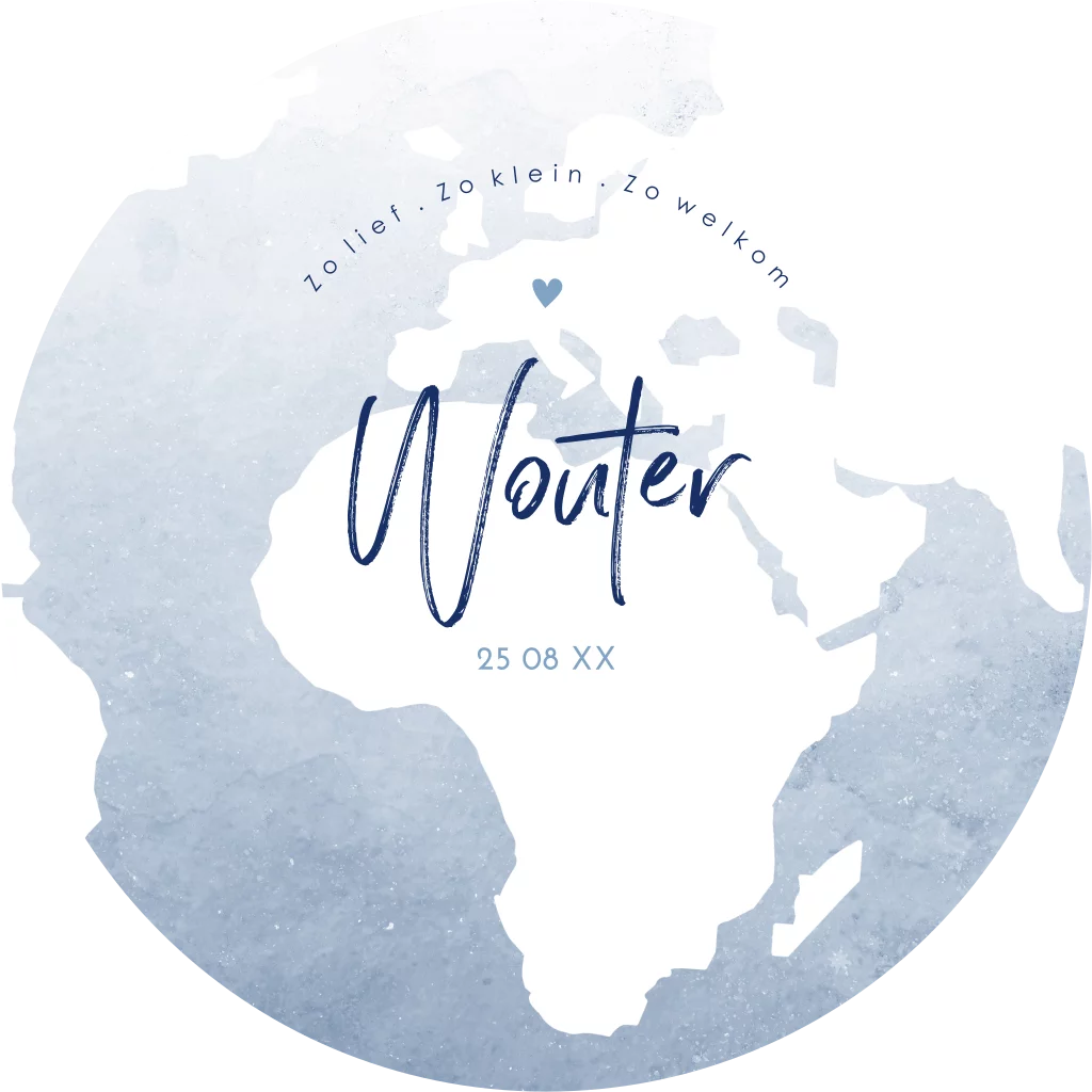 Stoere geboortekaart in een ronde vorm met illustratie als de wereldbol en blauw waterverf de achtergrond. De kleuren, teksten en het lettertype kun je zelf aanpassen en de teksten kunnen eventueel ook in foliedruk.