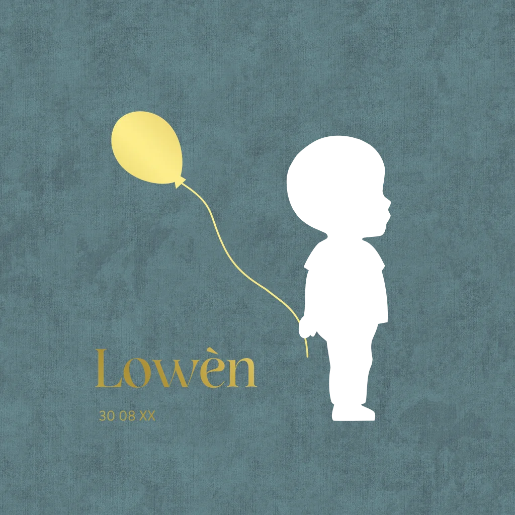 Dit gave geboortekaartje met het silhouet van een jongetje als doorkijkje kun je zelf bewerken door de kleuren aan te passen. Het goudfolie hier zorgt voor een sjieke uitstraling, de kleur aan de binnenkant zorgt voor het contrast in het silhouet