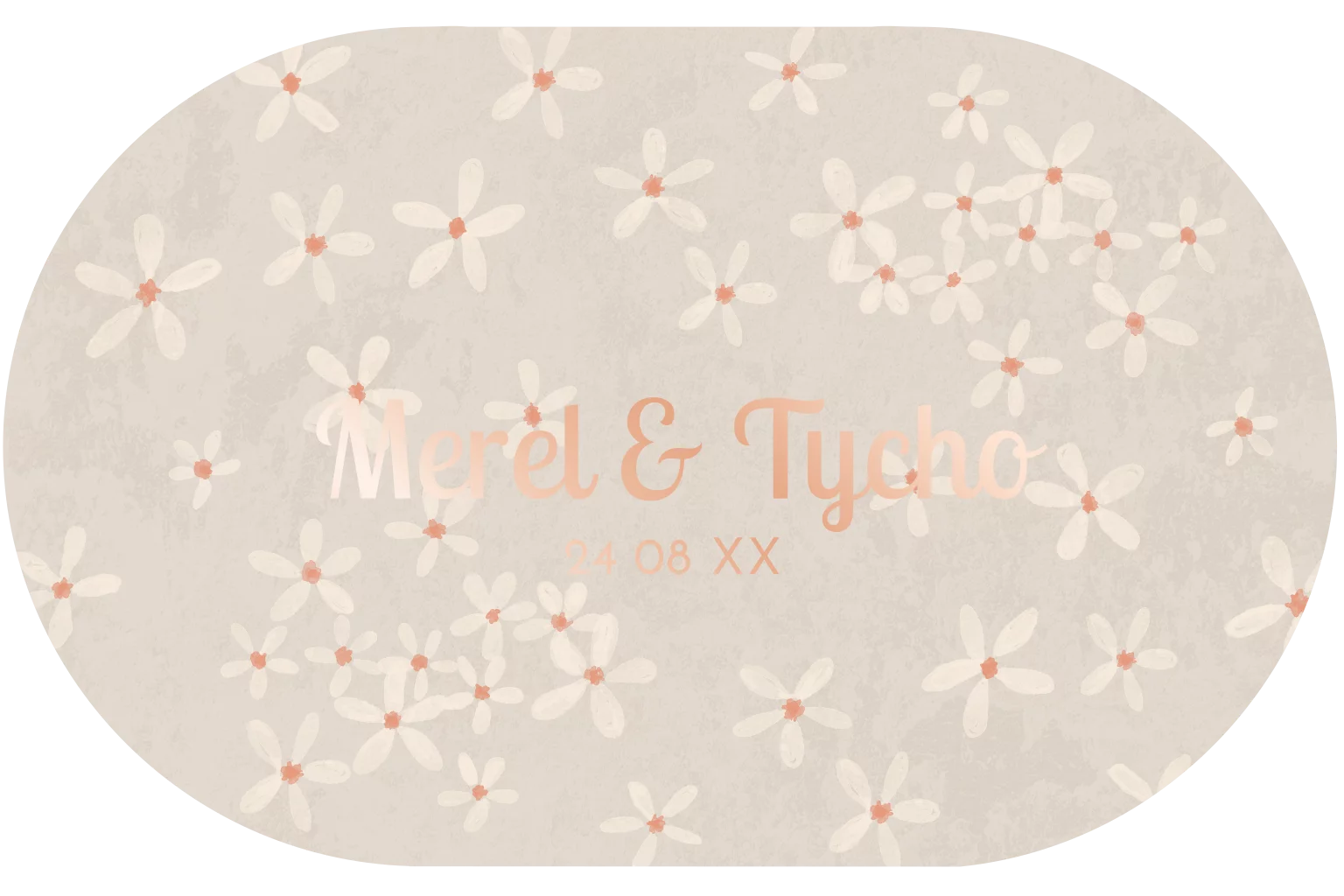 Liggende ovale trouwkaart met de namen in foliedruk en een dessin met lieve kleine bloemetjes in pasteltinten.