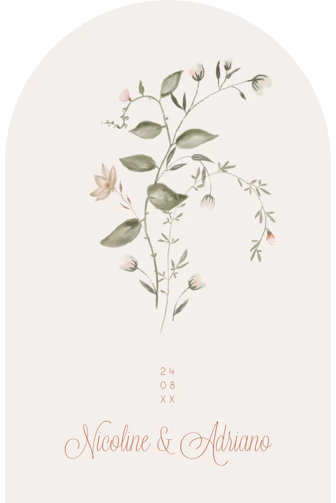 Deze mooie trouwkaart met ronde bovenkant en geschilderde bloemen en takjes kun je zelf bewerken voor jullie huwelijk. Deze toffe stans trouwkaart heeft een gebogen bovenkant en getekende planten en bloemen, de teksten en kleuren kun je zelf aanpassen.