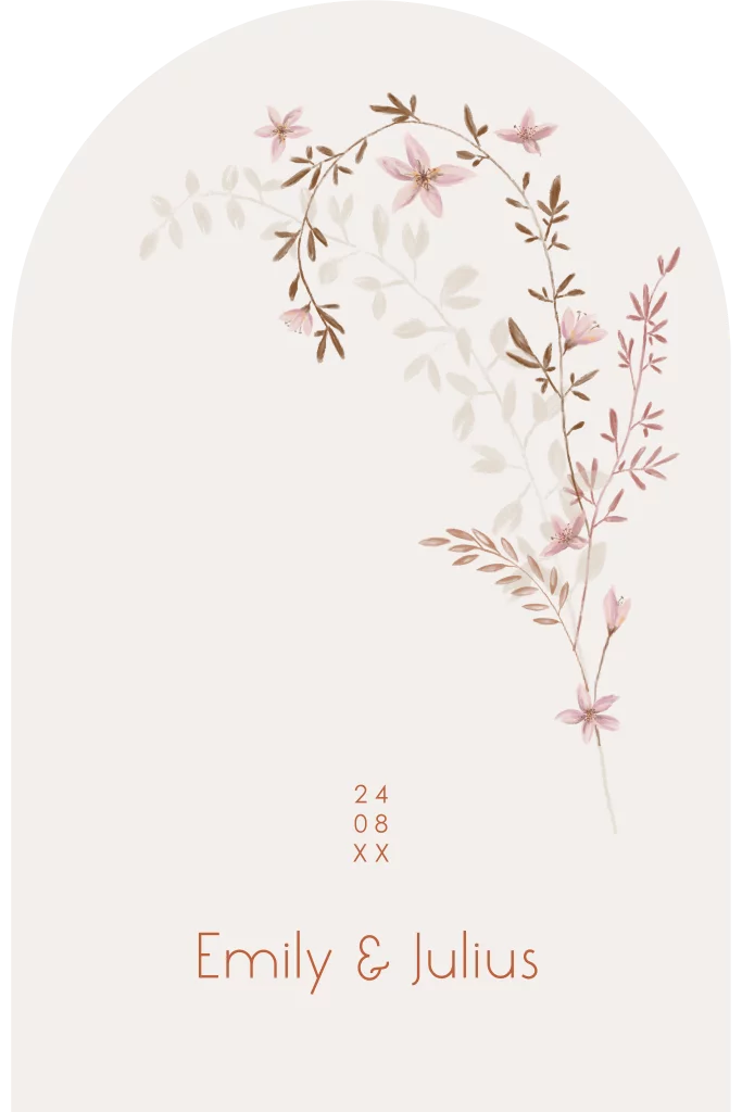 Deze mooie trouwkaart met ronde bovenkant en geschilderde bloemen en takjes. Deze toffe trouwkaart heeft een boog-vorm en de teksten en kleuren kun je zelf aanpassen.