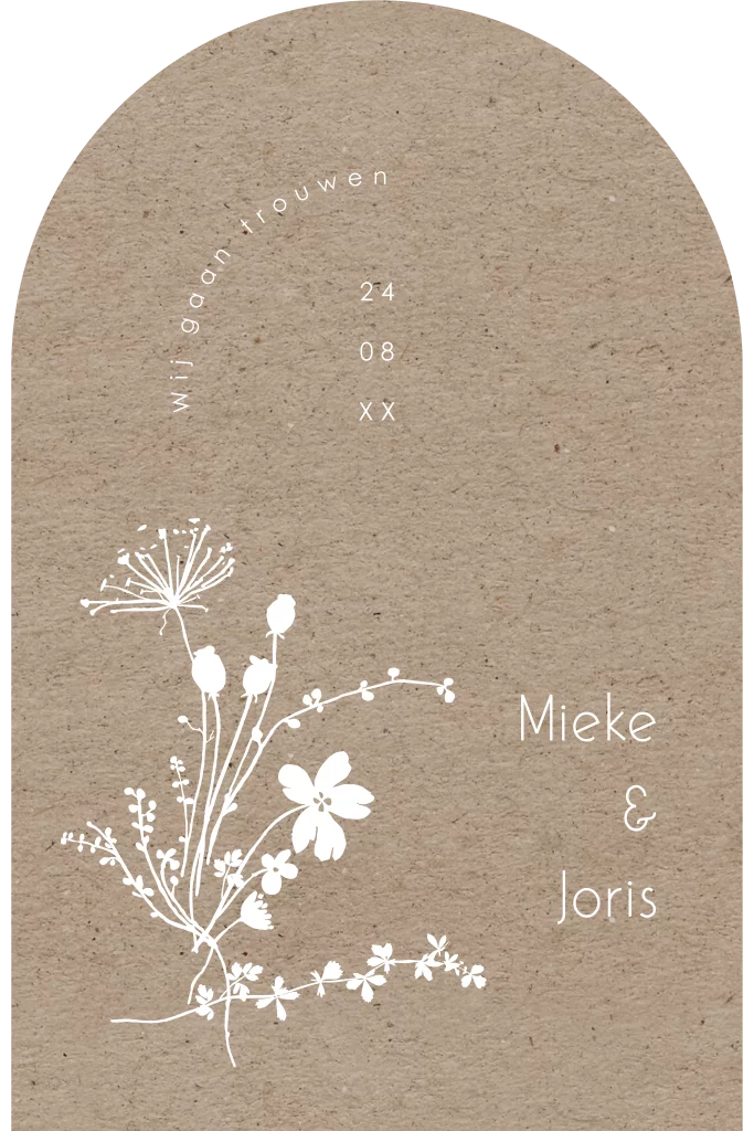 Deze mooie kraft-look trouwkaart met ronde bovenkant en bloemen boeket kun je zelf bewerken. Deze toffe trouwkaart heeft een boog-vorm en een kraft-look achtergrond, de teksten en kleuren kun je zelf aanpassen.