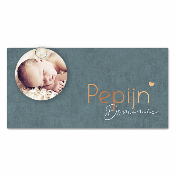 Een prachtig liggend geboortekaartje wat bestaat uit een hoofdkaart en een los rond fotokaartje. Het geboortekaartje is hier afgewerkt met de naam in goudfolie maar je kunt de kleuren zelf naar wens aanpassen. Het ronde kaartje kun je bevestigen met een paperclip. Deze kun je bestellen bij de kaarten en kun je vinden bij 'leuks bij je kaartje'. Op dit kleinste kaartje kun je een leuke foto toevoegen van jouw kindje. De grootste hoofdkaart is 20 x 10 cm en past in een envelop van 11x22 cm