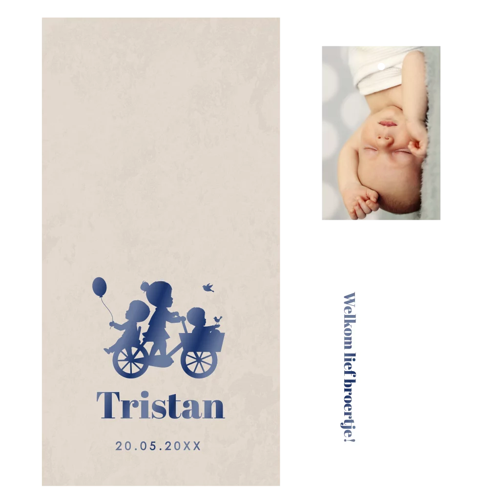 Een mooie en luxe stapelkaartje welke bestaat uit 3 delen met het silhouet van drie kindjes op de fiets, hier gedrukt in hoogglans. Dit trendy stapel geboortekaartje wat bestaat uit meerdere kaartjes op elkaar. De drie kaartjes kun je aan elkaar te maken met een lintje, touwtje of clipje. Deze kun je bestellen bij de kaarten en kun je vinden bij 'leuks bij je kaartje'. De grootste hoofdkaart is 10,5 x 21 cm.