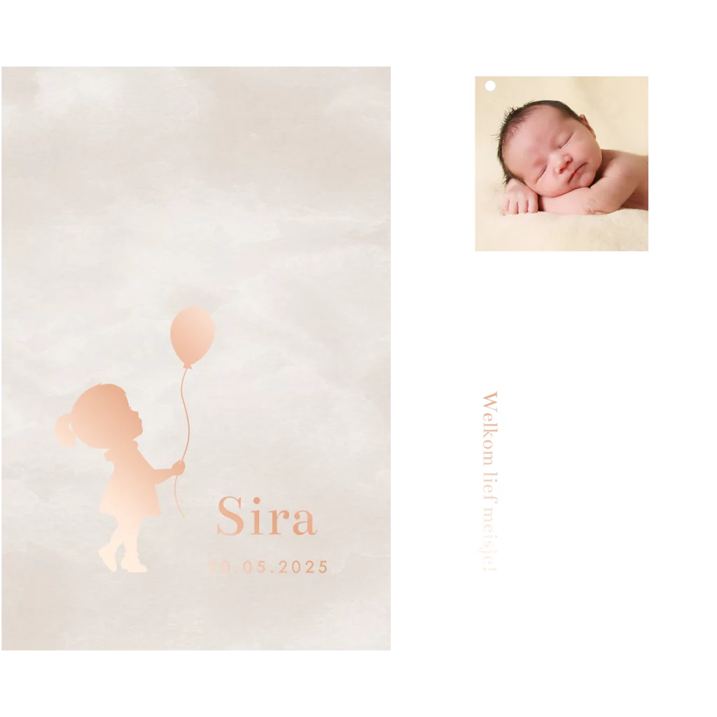 Een super mooi 3-delig label babykaartje met een silhouet in folie voor een luxe uitstraling en je kunt op de kleine labels een eigen tekst en foto plaatsen. Deze kaart kun je zelf eenvoudig aanpassen. Door een silhouet van een jongetje te kiezen in plaats van een meisje is deze kaart ook voor een zoontje te gebruiken.