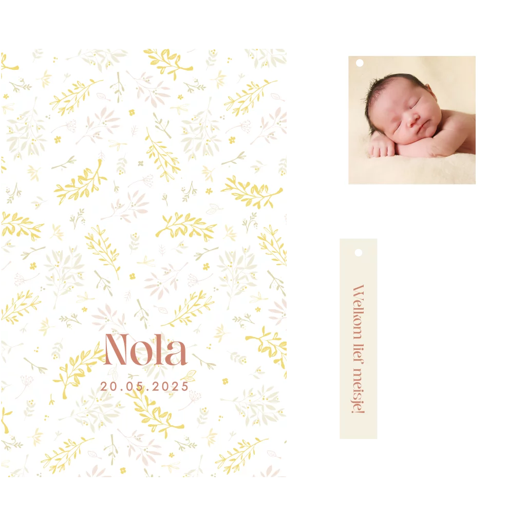 Een super mooi geboortekaartje bestaande uit 3 losse kaartjes die je met een mooi koordje aan elkaar kunt bevestigen. Op de hoofdkaart vind je een dessin in beige en gele tinten en op het vierkante kaartje is ruimte voor een foto