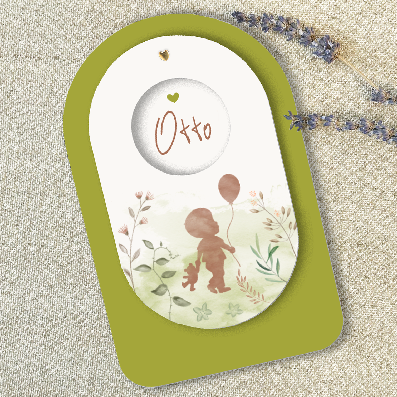 Een lief geboortekaartje wat bestaat uit 2 delen. De onderste kaart heeft een Arch vorm en ronde hoeken. De bovenste ovale kaart heeft een doorkijkje waardoor de naam zichtbaar wordt. Op de voorgrond een watercolour silhouet van een jongetje met een beertje en een ballon tussen kleine handgetekende blaadjes en takjes, die je eventueel ook andere kleuren kunt geven in onze online editor. Leuke splitpennen of touwtjes vind je ook op onze site om de kaarten aan elkaar te bevestigen. Bestel snel een proefdruk om dit kaartje in het echt te zien!