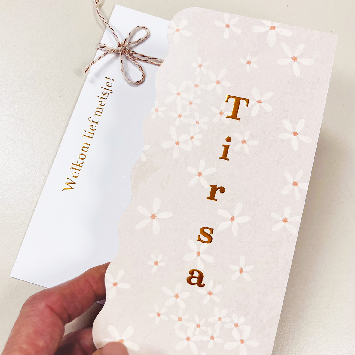Een schattig 2-delig label-kaartje voor een meisje met kleine geschilderde bloemetjes. Deze kaart bestaat uit 2 delen die je zelf kunt bewerken en met een leuk clipje kunt bevestigen.