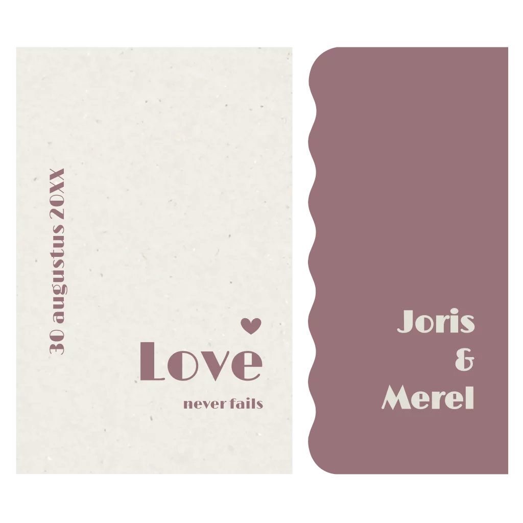 Een trendy stapel trouwkaart wat bestaat uit meerdere kaartjes op elkaar. De twee kaartjes kun je zelf bewerken en aan elkaar maken met een lintje, touwtje of clipje. Deze kun je bestellen bij de kaarten en kun je vinden bij 'leuks bij je kaartje'. De grootste hoofdkaart is 11,4 x 17,1 cm.