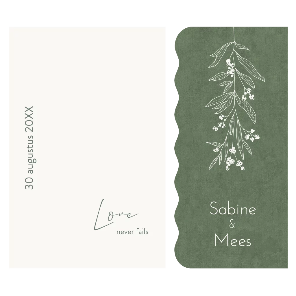 Gefeliciteerd met jullie voorgenomen huwelijk! Nodig jullie gasten uit met deze toffe 2 delige trouwkaart met een illustratie van bloemen op een velvet-achtige achtergrond. De bovenste kaart heeft een golvende uitgestanste rand wat een sjiek effect heeft, op de achterzijde is er ruimte voor het dagprogramma , de ceremoniemeester en locatie. Deze kaart kun je eenvoudig zelf aanpassen door de afbeeldingen bijvoorbeeld in goudfolie te zetten.