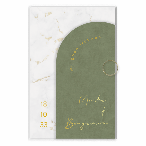 Een prachtige trouwkaart die bestaat uit 2 delen met jullie namen in goudfolie gedrukt op een deels marmer en velvet groene achtergrond die je ook kunt omwisselen voor een andere kleur of afbeelding. De twee kaartjes kun je zelf bewerken en aan elkaar maken met een lintje, touwtje of clipje. Deze kun je bestellen bij de kaarten en kun je vinden bij 'leuks bij je kaartje'. De grootste hoofdkaart is 11,4 x 17,1 cm.