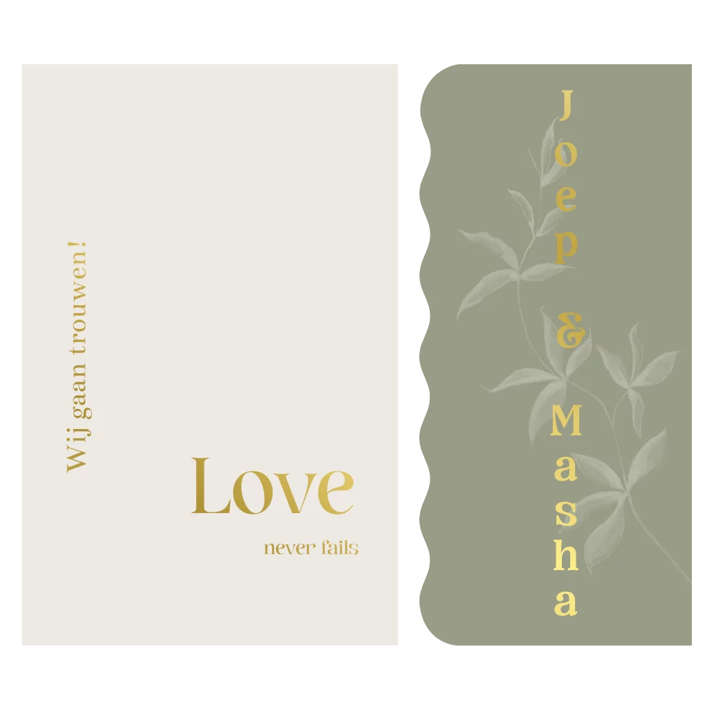 Een tof 2-delig unisex label-kaartje met een goudfolie en een met waterverf geschilderde tak met bladeren. Een luxe trouwkaart die bestaat uit 2 delen.