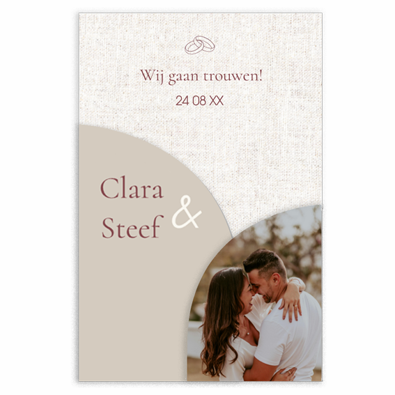 Deze luxe 3-delige trouwkaart met een foto bestaat uit een hoofdkaart en twee losse boogvormige kaartjes. Deze bijzondere stijlvolle uitnodiging voor een bruiloft met linnen effect achtergrond kun je zelf bewerken. Er is ruimte voor het dagprogramma en extra teksten op de achterzijde van de kaarten. Bevestig deze kaartjes met een mooie rondvormige paperclip die je ook op onze site kunt bestellen.